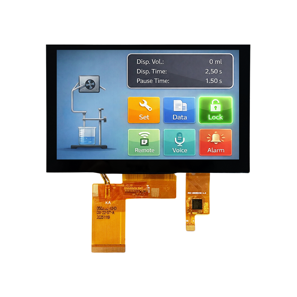 5 inch Full-Lamination Touch Display MX-050WR40BFH-N15-H023 provides exceptional clarity with an 800x480 IPS panel and 1000 cd/m² high brightness, utilizing optical bonding technology to eliminate air gaps. This sunlight-readable module features a 40-pin RGB interface for the LCD display and a capacitive touch screen with a GT911 I²C controller, offering a professional-grade, gap-less solution for high-end industrial and medical applications.